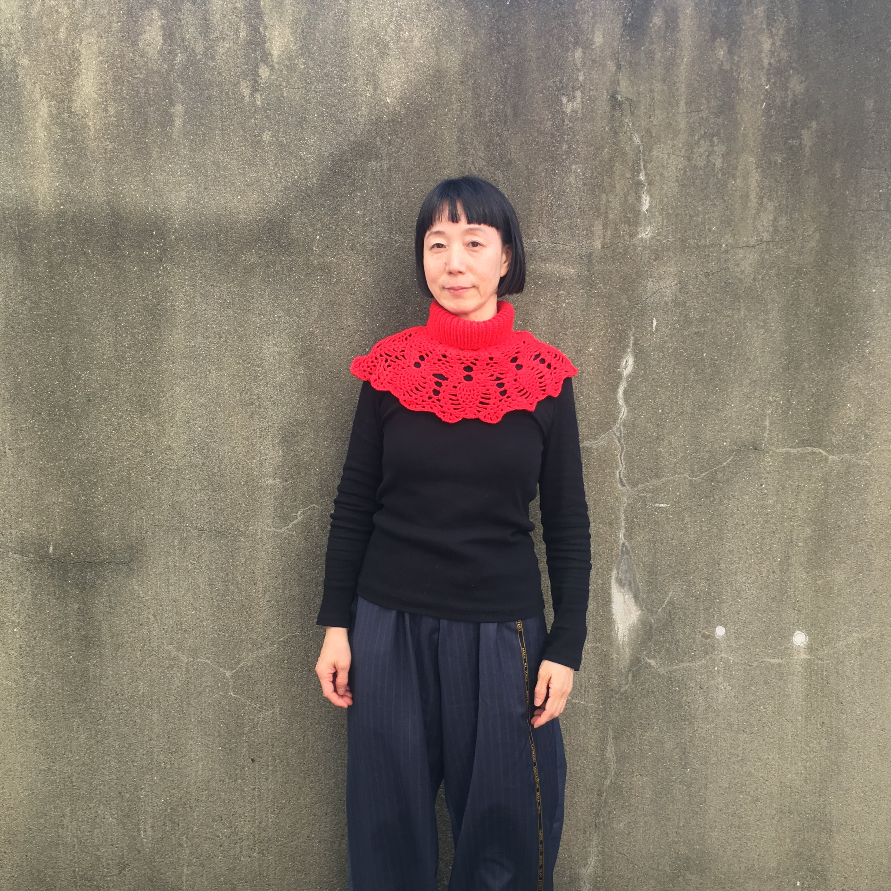 真っ赤で映える小さめの首だけセーターです。肩ぴったりめです。