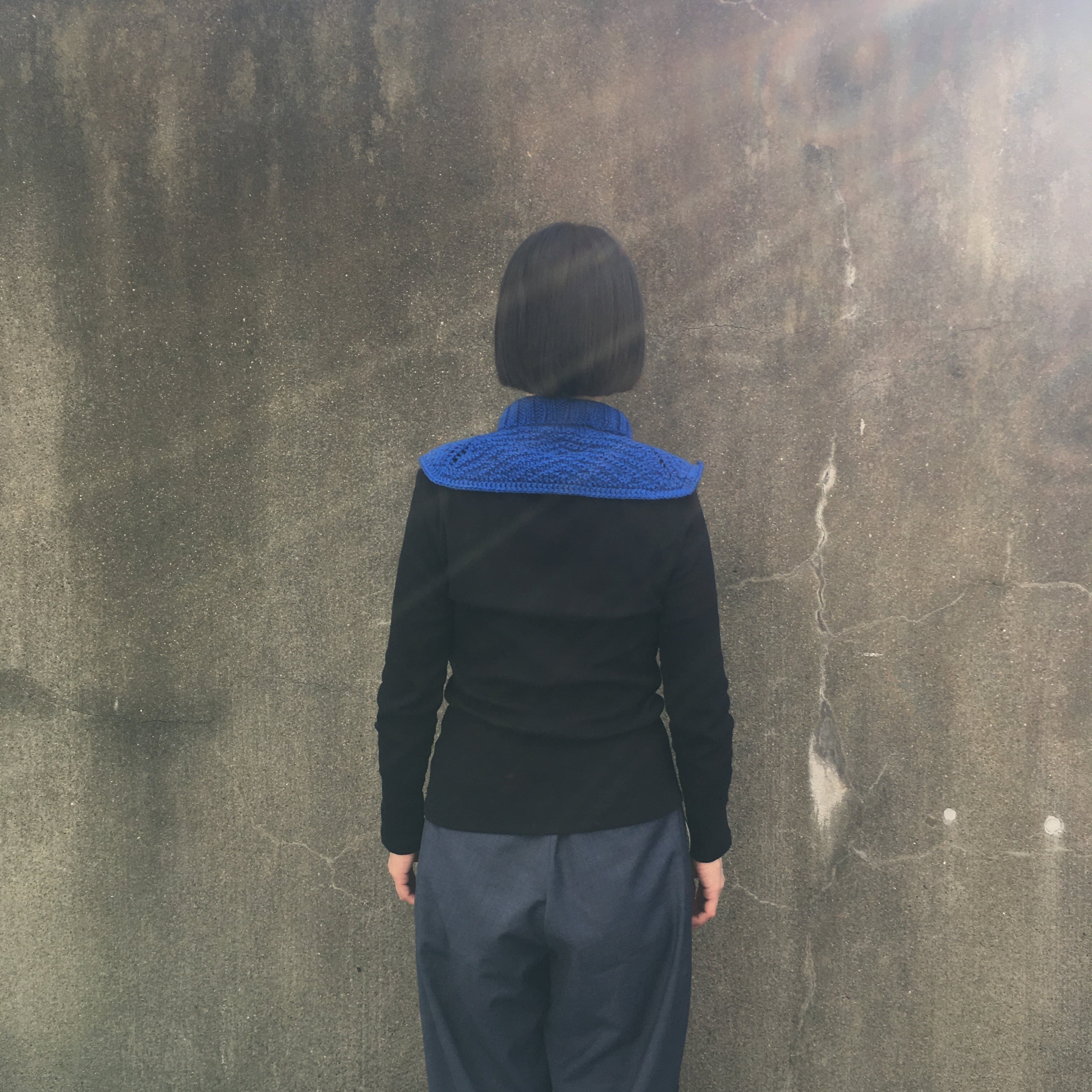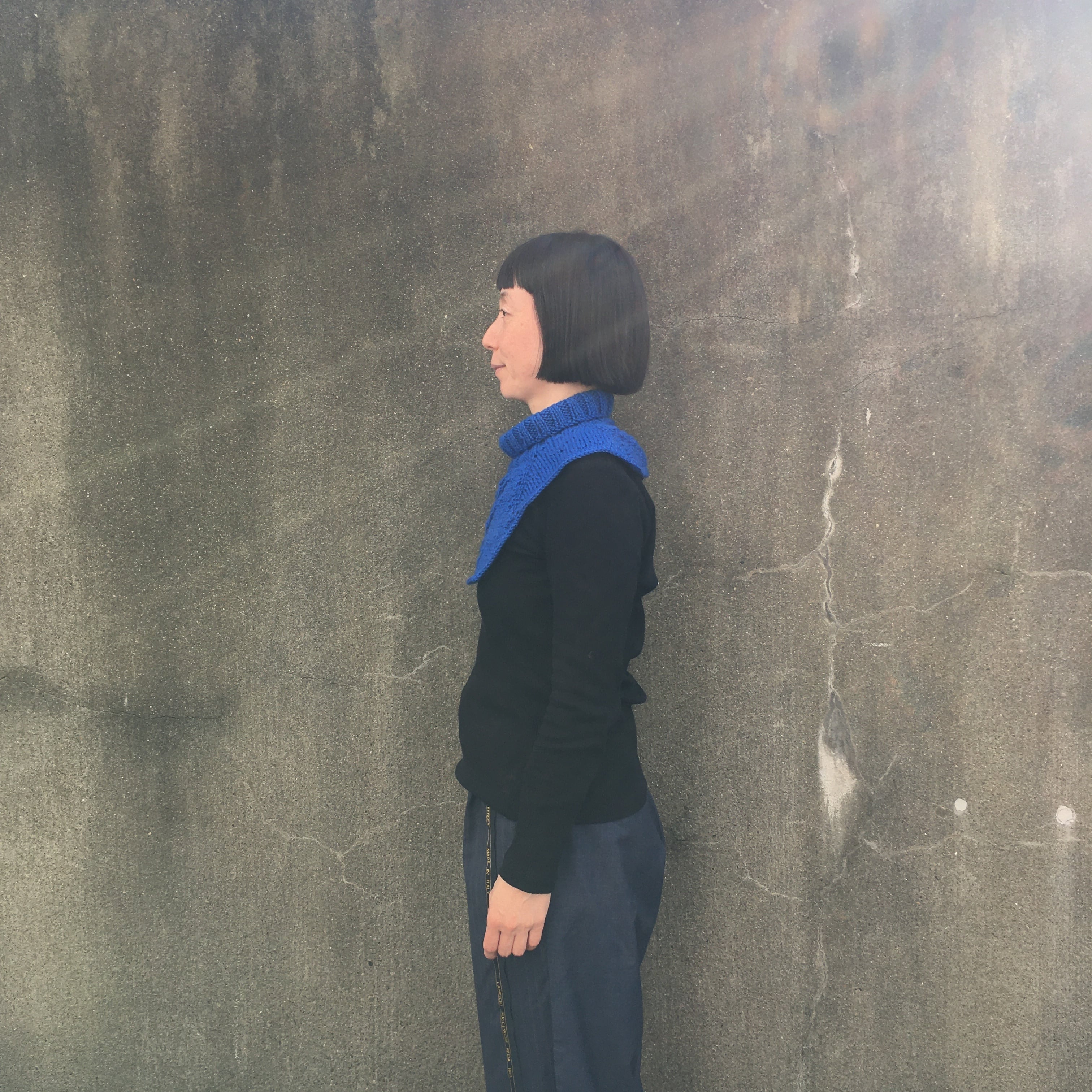 軽くて首周りゆったりした、鮮やかなブルーの首だけセーターです。