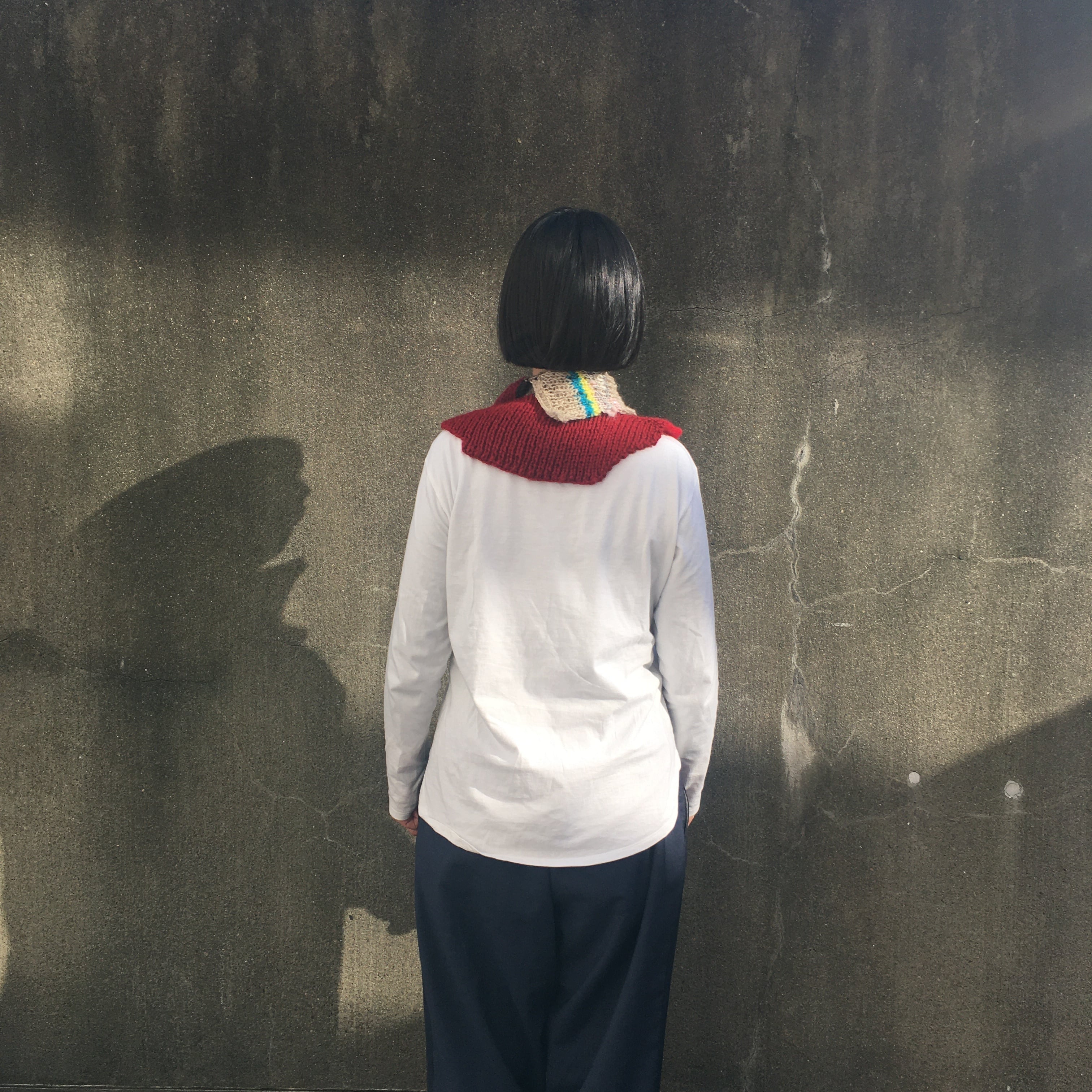 キラキラ&ピンクの糸が効いた首だけセーターです。前後関係なく着用できます。