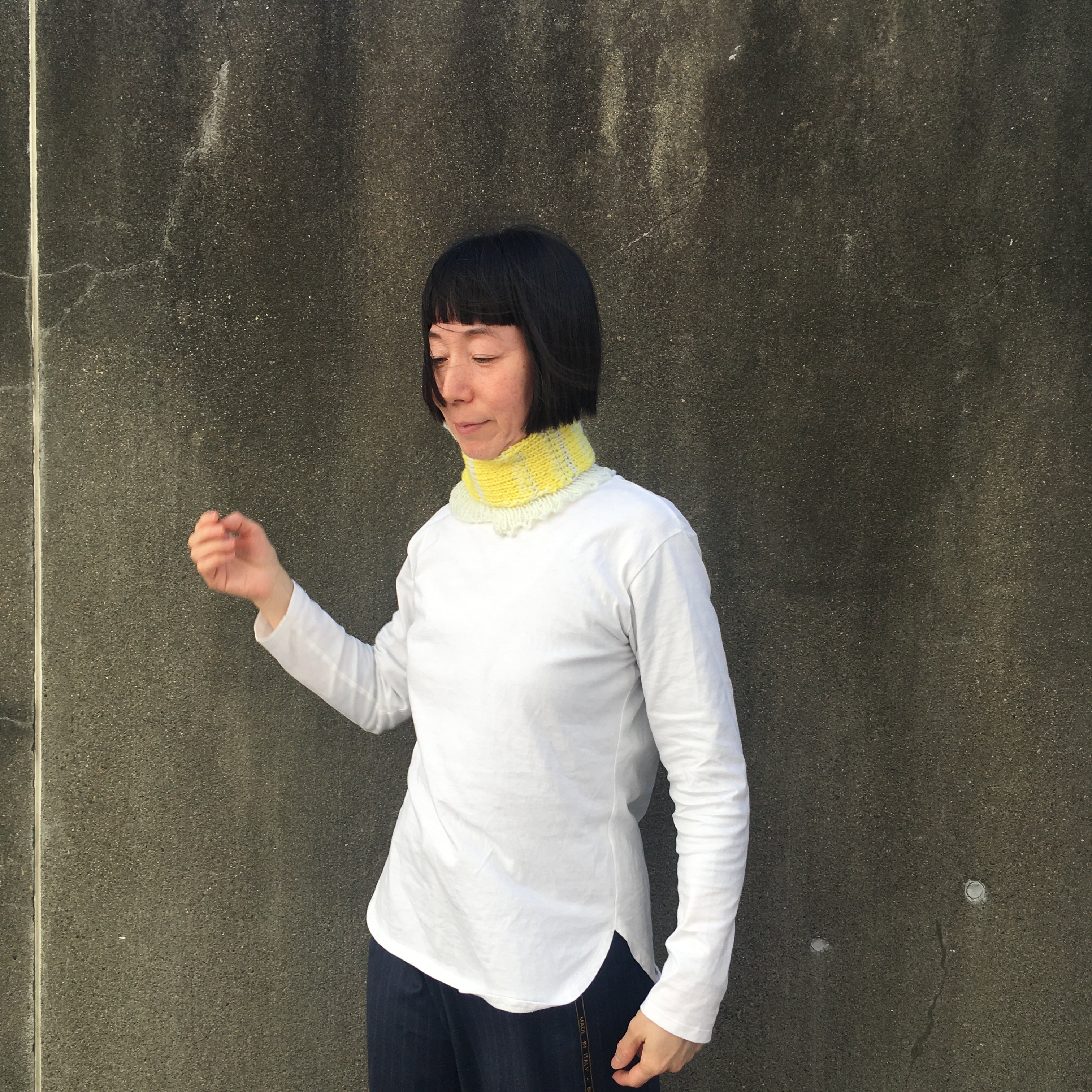 襟ぐりを絞ったり、マフラーのように巻いたり、着方自由です。