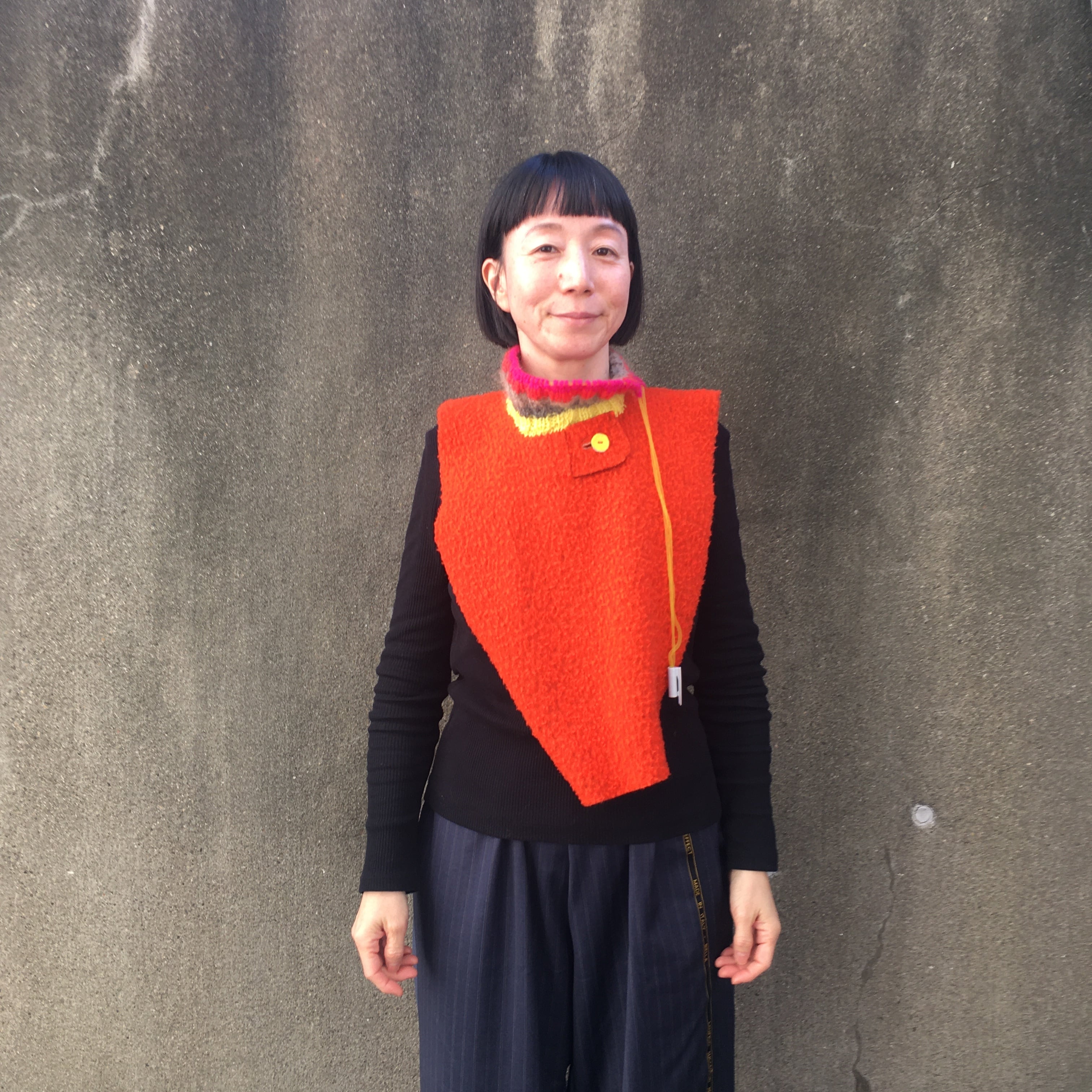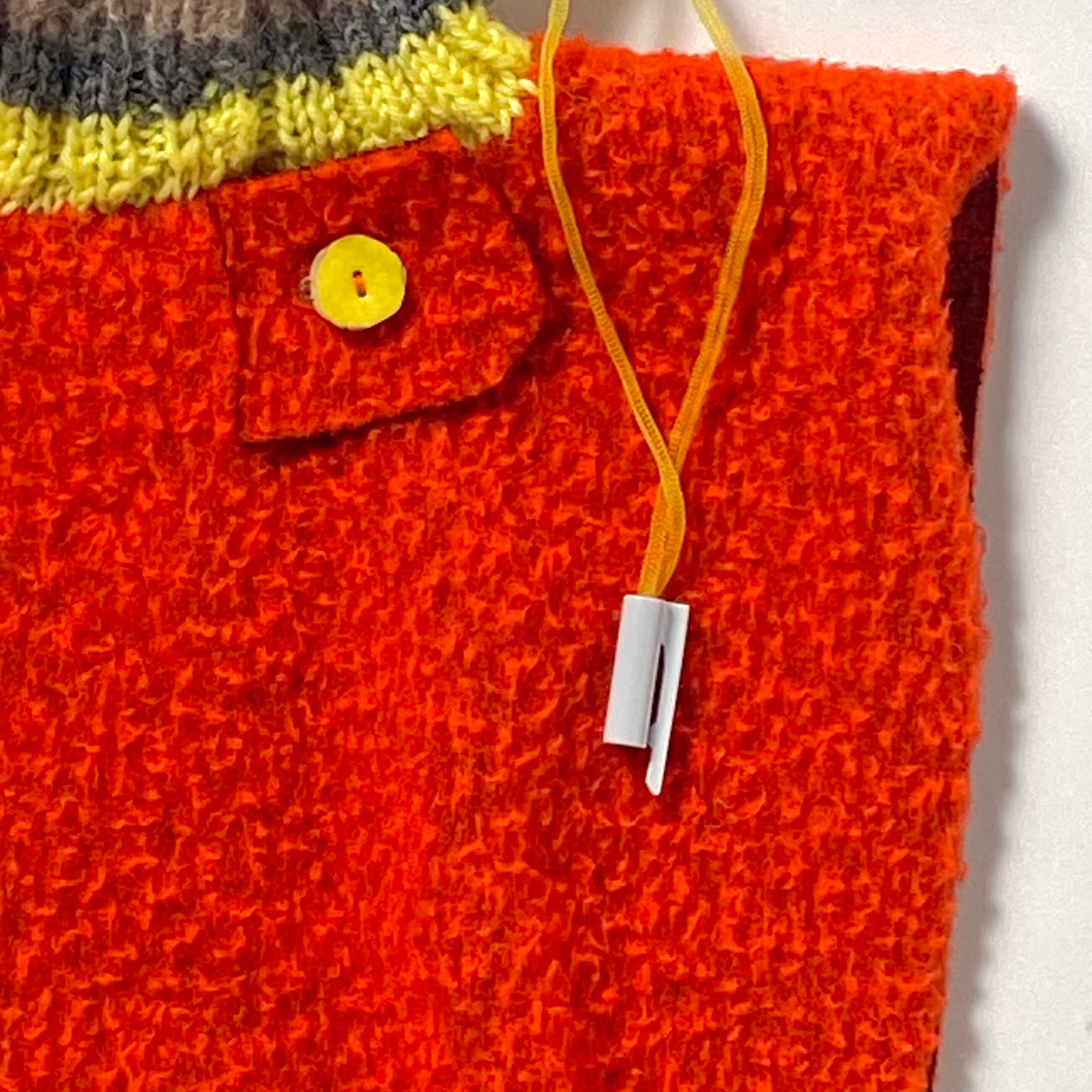 オレンジ色のニット地に手編みのネックが付いています。被る時かなりきつめです。ネック上部はナイロンチューブの紐で絞れて、チューブの先にはペンのキャップがコラージュされています。前身頃の裾は左右が縫い止められているので立体的になります。アヴァンギャルドの頂点を着こなせる方にぜひ。